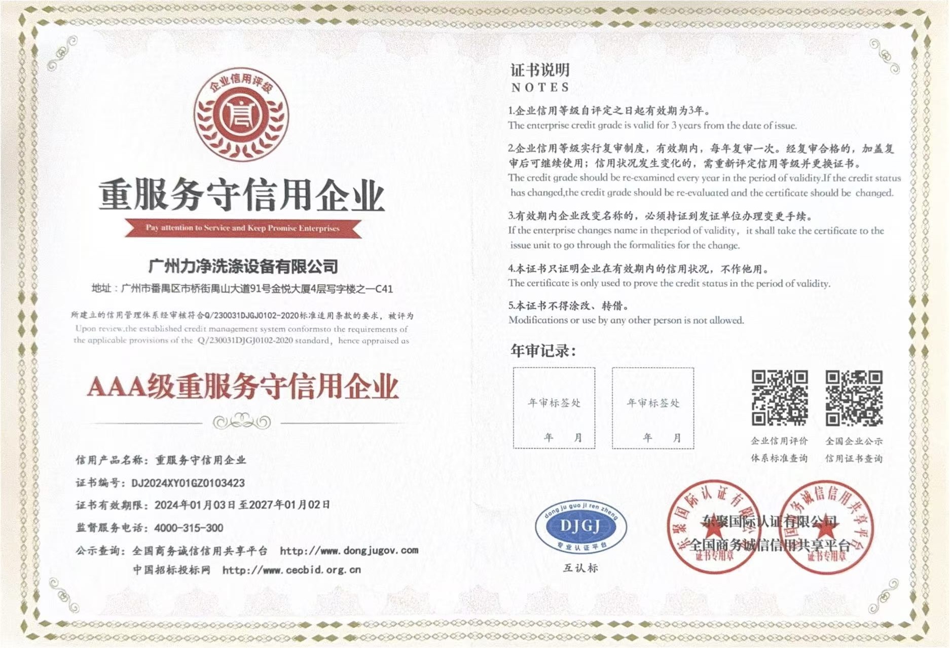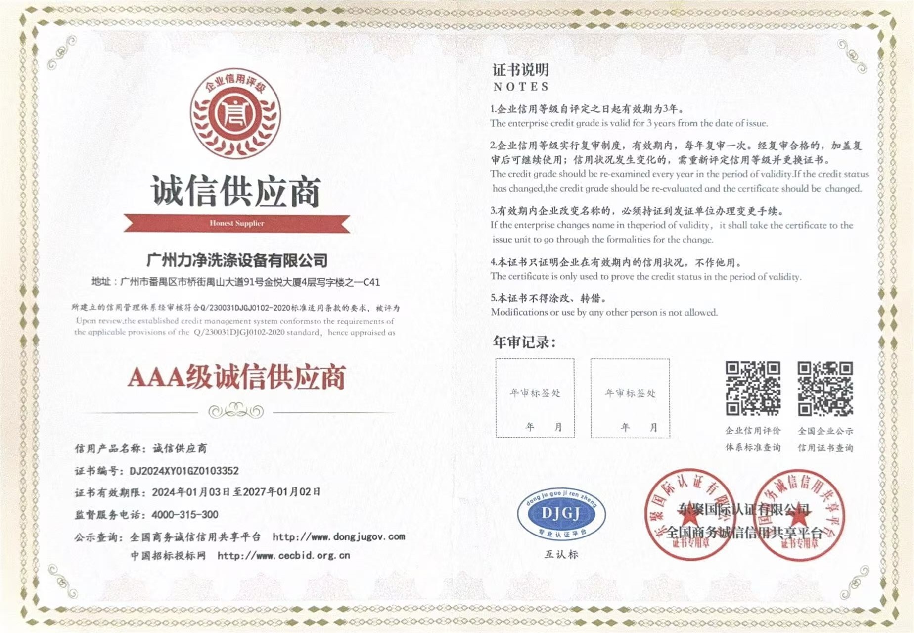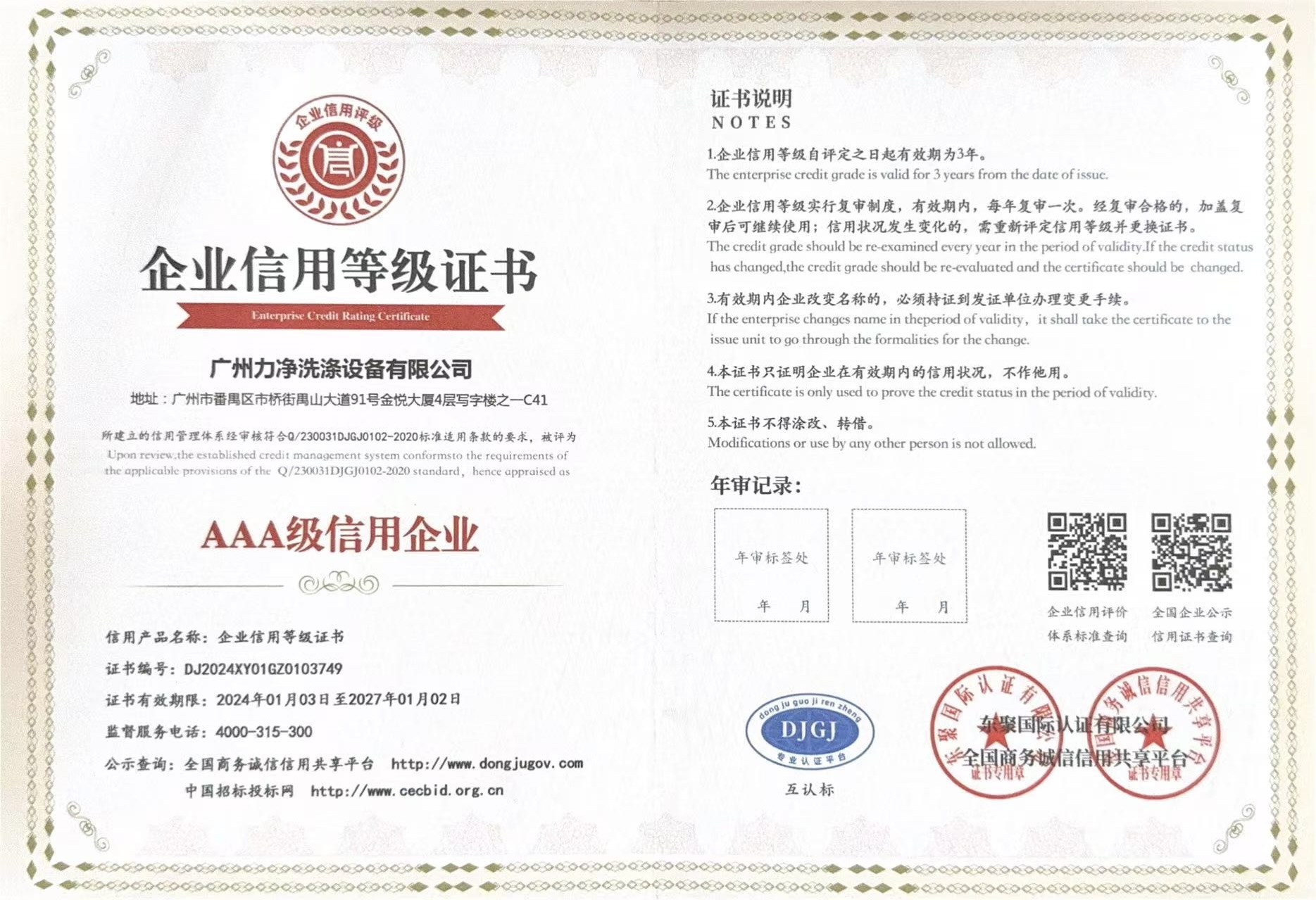 • AAA企業信用等級證書